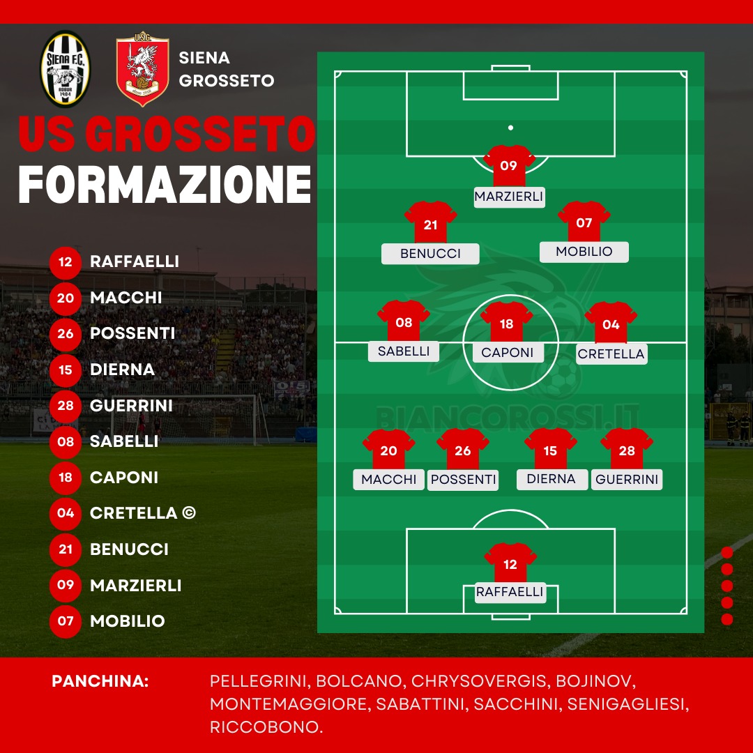 La formazione iniziale del Grosseto che tra poco scenderà in campo per affrontare il Siena.